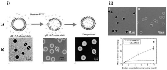 For instance, a study [] demonstrates that, at rather high pH values (pH above 7.5), the hollow poly(allylamine hydrochloride) (PAH)/poly(styrene sulfonate) (PSS) capsules prepared are impermeable (“closed” state) and at lower pH (below 6.5) the shells are permeable (“open” state). This is due to an increase in the protonation of PAH primary amino groups, and hence there are more repulsive interactions between the like positive charges of those groups, and thus more voids/pores within the multilayers. If the pH is shifted back to higher values (pH more than 7.5), the dextran-labelled with fluorescein isothiocyanate (FITC) that has permeated within the capsules will be entrapped as soon as the capsule shell will change its permeability. The permeability of shell membrane by varying the pH and dextran-FITC encapsulation are demonstrated in Figure 7i.