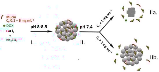 Schematic of the co-synthesis of CaCO3-mucin hybrid crystals containing doxorubicin (I) and the release of doxorubicin at physiologically relevant conditions (II) via diffusion of mucin-doxorubicin complex out due to the re-crystallisation of the CaCO3 crystals to calcite (IIa) and the complex diffusion out of the pores of the vaterite crystals (IIb). This schematic is taken with permission from reference [], copyright© 2019, Elsevier.