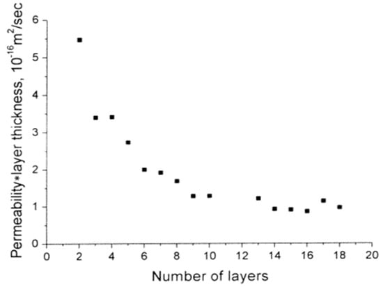 A graph showing the relationship between permeability and number of deposited layers, for (PSS/PAH) PEMCs, when fluorescein is encapsulated within. Permeability determined via the flux of fluorescein through the capsule wall. This figure is taken with permission from reference [], copyright© 2001, American Chemical Society.
