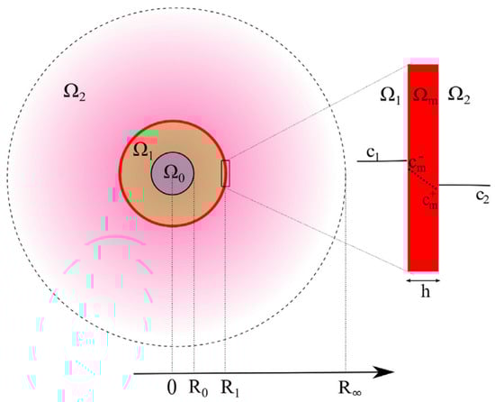 A model of a capsule with several parameters considered during release. 0—is a centre of the particle, R0—is distance from the centre to surface of CaCO3, R1—distance to capsule wall, R∞—distance to the edge of diffused contents. Ω0—defines the area of undissolved CaCO3 loaded with biomolecules, Ω1—defines the area where biomolecules are free to move inside the capsule, Ω2—represents the system outside of capsules. The red line represents capsule wall, h—is the capsule wall thickness, c1 and c2—represent the route of travel for flux of contents in and out of capsule, cm—represents the route of travel through pores in capsule wall, which is almost never equal to h. This figure is taken with permission from reference [], copyright© 2018, Elsevier.