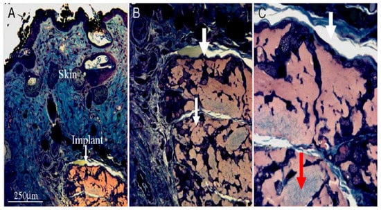 Optical microscopy images taken after in vivo implementation of differentiated EB in the presence of activate capsules (capsules incorporated with GFs) and alginate gel matrix. (A) subcutaneous section visualisation of skin (blue) and the implant (orange); (B,C) enlarged images of implant section representing the vascularisation (white areas) and suggested bone induction (grey area, red arrow). This figure is taken with permission from reference [].