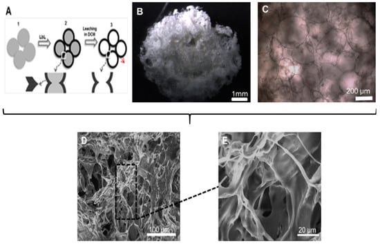 Silva et al. [] designed a 3D nano-structured construct based on the biopolymers CHT and chondroitin sulphate (CS) multilayers for cartilage TE. For the fabrication of this advanced scaffold, two steps were used: (i) CHT and CS were templated on packed paraffin spheres via the LbL deposition and, (ii) the spheres were leached out as shown in Figure 12A,B using an organic solvent. In addition, it was reported that the scaffolds had a bubble-like morphology and they adopted the geometry and pore sizes of the paraffin sphere templates, also illustrated in Figure 12B,C. The diameter of the paraffin spheres used as porogens was of 200 µm, which allows the cellular activities to occur with no limitations (i.e., formation of the ECM and cell infiltration). Moreover, after freeze-drying the scaffolds, a porous and interconnected structure was observed in the scanning electron microscope (SEM) images in Figure 12D,E.