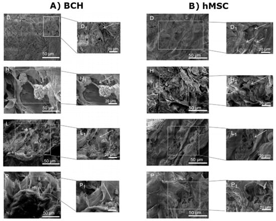SEM images of the cell seeding on CHT/CS scaffolds after 1-day (D), 3 days (H), 14 days (L) and 21 days (P). (A) BCH cells seeded on scaffolds and (B) hMSC cells seeded on scaffolds. This figure is taken with permission from reference [], copyright© 2013, Silva et al.