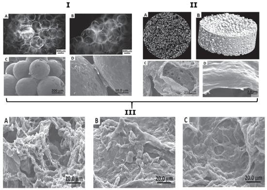 Images illustrating: (I) the interconnected PEMCs in 1D (A and B) and in 3D. (II) scaffold made of the PEMCs in 2D and 3D (A and B, respectively, from X-ray microtomography) and the internal structures of the scaffold (C and D). (III) SEM images of scaffolds with cells for cell culture after 24 h (A), 3 days (B), and 7 days (C). This figure is taken with permission from reference [], copyright© 2010, John Wiley and Sons.