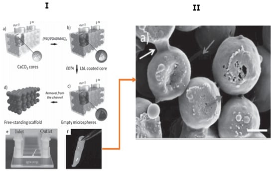 The pioneering work in the microfluidic assisted formation of the PEMC-based scaffold has been carried out using PDADMAC and PSS polymers, templated upon vaterite CaCO3 crystals via employing the fluidic self-assembly deposition method (Figure 15I) []. For the construction of the 3D porous scaffold, the CaCO3 crystals were packed inside a microfluidic channel (Figure 15(Ia)) and five alternate bilayers of PSS and PDADMAC were deposited on the cores (Figure 15(Ib)), followed by the removal of the CaCO3 using EDTA, leading to formation of hollow closely-packed PEMCs—i.e., a scaffold (Figure 15(Ic,Id)). The formed scaffold can be removed from the microchannel and will keep the dimensions of the channel in which it was formed, providing simple control of scaffold dimensions (Figure 15(Id–If)). The scaffold was analysed using SEM, indicating that the PEMCs were interconnected, as illustrated in Figure 15II. Cells can adhere to the porous PDADMAC/PSS scaffolds, and prefer scaffolds with the size of PEMC similar or comparable to the size of a cell (ca. 10 µm) []. Scaffolds formed with smaller or larger PEMCs have been shown to be cell repellent, and this may be caused by both topological or mechanical issues due to scaffold internal structure. One would expect that such scaffolds assembled from biopolymers such as the hyaluronic acid/PLL pair may also possess good cell adhesion if their mechanical properties are suitable [].