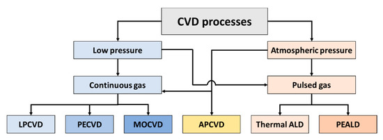 There are several models of CVD reactors and processes, as summarized in Figure 1. In practice, the reactors can be of two types: cold or hot wall, meaning that the reactor walls have lower temperatures or the same order of magnitude as the substrate. They can operate in the atmospheric pressure (APCVD) or sub atmospheric pressure, which is generally in the range of 1 Torr to 10 mTorr. In addition, for LPCVD systems, the growth reaction energy is purely thermal or enhanced with the use of a plasma source. The last type of CVD reactor is termed as plasma-enhanced chemical vapor deposition (PECVD). Another type of CVD reactor operated at low pressure is the metal–organic CVD (MOCVD) that is done by flowing a reactive metal–organic precursor vapors over the heated substrates. Regarding atmospheric and low-pressure CVD processes, it is important to note that they operate at continuous gas feed; that is, as an “analogical type mode”, a fact that creates a series of difficulties in controlling film thickness and conformity on different types of substrates, thus limiting the use of these techniques in applications that require films with ultra-thin thicknesses (below 100 nm). In this sense, the idea of carrying out self-limited reactions of precursors at the surface level has been an ingenious and effective solution, and for that, it is necessary to insert the precursors in the reactor separately so as not to promote the reaction between them in the reactor volume; in other words, the CVD process occurs in a “digital type mode”. This variant of the CVD process is known as atomic layer deposition (ALD), whose main characteristic is to promote self-limited surface reactions, which allow us to obtain conformal coatings with uniformity superior to CVD techniques.