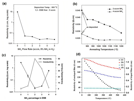 The electrical resistivity of nitrogen-doped 3C-SiC films as a function of (a) NH3 flow rate in deposition process and (b) annealing temperature reported by Wijesundara et al. Reproduced with permission from [124] published by Elsevier, 2003, (c) the resistivity and the conductivity of the 3C-SiC films as a function of NH3 content in the deposition process reported by Wijesundara et al. Reproduced with permission from [125] published by Elsevier, 2002, (d) effect of temperature on the electrical resistivity of 3C-SiC films with different nitrogen doping concentration: (a) 0, (b) 9%, (c) 17%, and (d) 30% reported by Latha et al. Reproduced with permission from [126] published by Elsevier, 2015.