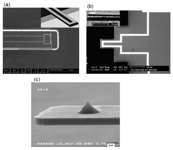 In relation to SiC cantilever resonators, Jiang et al. designed, fabricated, and tested Pt electrodes on single crystal 3C-SiC cantilevers and NiCr electrodes on poly-crystalline 3C-SiC cantilevers, Figure 6a,b, respectively. They observed that electrothermal actuation of resonance was achieved for both structures [139]. In another interesting article published in 2012, Jiao et al. proposed an approach using inductively coupled plasma etching (ICP) to fabricate monocrystalline silicon tips on 3C-SiC cantilevers for the elaboration of an entire cantilever for atomic force microscopy (Figure 6c) [140]. In a review article published in 2016, Wood et al. summarized the literature on 3C-SiC resonators concluding that they are good alternatives to Si for developing MEMS-based oscillators [141]. Recent publications on 3C-SiC MEMS resonators report the fabrication and testing of monocrystalline 3C-SiC on SOI electrostatic MEMS resonators [142] and a highly doped 3C-SiC bridge resonator [143].