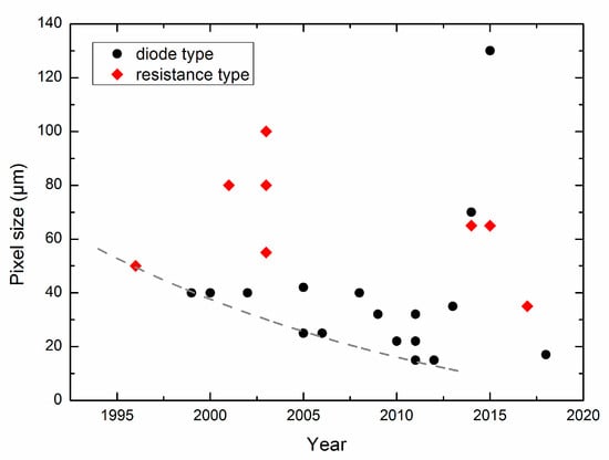 Trends of the pixel size reduction for complementary metal oxide semiconductor (CMOS)-compatible microbolometer infrared (IR) detectors, data taken from (in left-to-right order) [12,13,14,15,17,18,19,20,21,22,25,27,28,29,31,32,33,34,35,37,39,40,41,43,46].