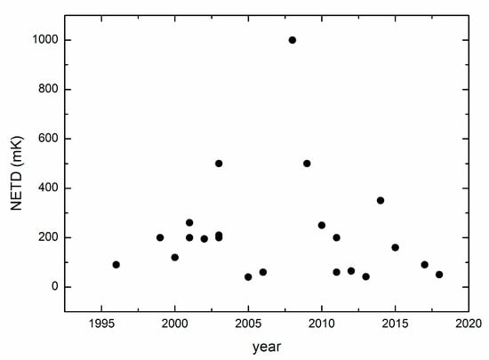 Trends of the noise equivalent temperature difference (NETD) for CMOS-compatible microbolometer IR detectors, data taken from (in left-to-right order) [12,13,14,15,17,18,19,20,21,22,25,26,27,28,29,31,33,34,35,37,40,46].