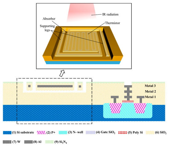 Figure 3 shows the pixel structure of the resistance type microbolometer. The microbolometer pixel contains three parts: the infrared absorber, the thermal sensor, and the microbridge structure. The infrared absorber usually consists of the dielectric layer or the multi-layer structure of dielectric and metal layers [74]. The thermal sensor is implemented using a CMOS-compatible thermistor layer sandwiched in the absorber, which is designed to be serpentine to maximize the resistance. The microbridge structure consists of two support legs to sustain the suspended area, creating a thermally isolated cavity between the absorber and the substrate in order to greatly reduce the thermal conductance. In an Al microbolometer, the IR absorber is implemented using the SiO2/Si3N4 layer, with the Al thermistor from the metal interconnect layer Metal 3 sandwiched inside the SiO2 layer. The SiO2 and Si3N4 also provide protection for the thermistor and the read-out circuit during the post-CMOS etching process.