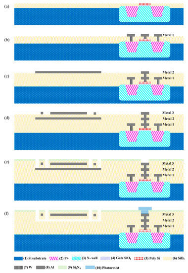 The process flow for an Al microbolometer: (a–e) are in a standard CMOS process and (f) is in a subtractive micro-electro-mechanical system (MEMS) process.