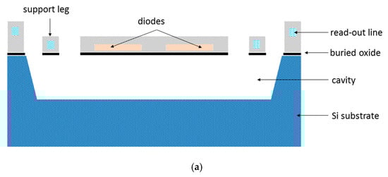 The pixel structure of the diode type microbolometer is similar to that of the resistance type microbolometer; it also consists of three parts: the infrared absorber, the thermal sensor, and the microbridge structure. Here the thermal sensor becomes the p-n junction diodes, which are connected in series to enlarge the output signal. The diodes are usually fabricated on the SOI film for several reasons: (a) The diodes fabricated on deposited Si film exhibit large 1/f noise [76,77]; (b) the diodes fabricated on Si substrate need a special electrochemical etch-stop technique to protect the n−well during the post-CMOS etching process [27,33,78]; (c) the SOI film is expected to have fewer defects and localized states which could reduce the 1/f noise. The pixel structure of a SOI diode detector is shown in Figure 5. The BOX (buried oxide) layer and the dielectric film over the diodes protect the diodes during the post-CMOS etching process.