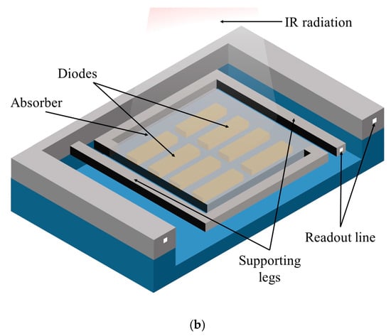 - Takamuro, D.; Maegawa, T.; Sugino, T.; Kosasayama, Y.; Ohnakado, T.; Hata, H.; Ueno, M.; Fukumoto, H.; Ishida, K.; Katayama, H. Development of new SOI diode structure for beyond 17 μm pixel pitch SOI diode uncooled IRFPAs. In Proceedings of the SPIE Defense, Security, and Sensing, Orlando, FL, USA, 25–29 April 2011; Volume 8012. [Google Scholar]