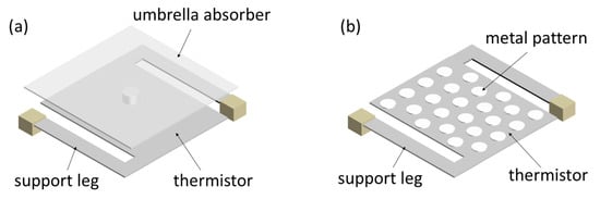 The umbrella absorber is a widely adopted design to maximize the absorber area that captures more incident IR energy. As shown in Figure 6a, it consists of an IR absorber layer, which individually suspends over the bolometer and support legs, supported by one or more posts. The umbrella absorber consists of dielectric layer or multi-layer structure of metal and dielectric layers, which is the same as that of the conventional absorber layers. Some umbrella absorbers have etch holes designed to enhance the sacrificial removal. These etch holes also benefit the responsivity due to the decrease of thermal capacitance of the umbrella absorber [79]. The umbrella absorber can achieve a fill factor above 90% and ~23% improvement in responsivity [72]. This structure provides the fill factor close to an ideal value at the expense of more process steps, usually increasing 2–5 masking layers and corresponding deposition and etching steps [45].