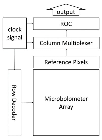 - Ueno, R.; Honda, H.; Kwon, H.; Ishii, K.; Ogata, M.; Yagi, H.; Fujiwara, I.; Suzuki, K.; Sasaki, K.; Funaki, H. Uncooled Infrared Radiation Focal Plane Array with Low Noise Pixel Driving Circuit. IEICE Trans. Electron. 2010, 93, 1577–1582. [Google Scholar] [CrossRef]