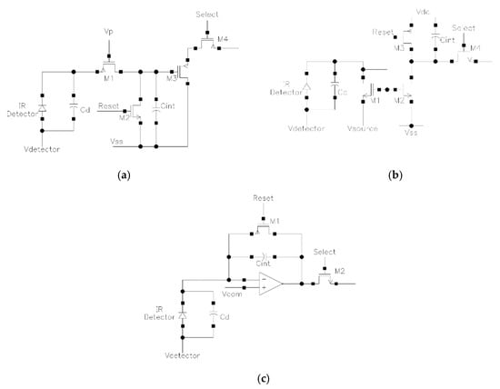 Structures of read-out circuit configuration: (a) direct injection (DI), (b) gate modulation input (GMI), and (c) capacitive transimpedance amplifier (CTIA).