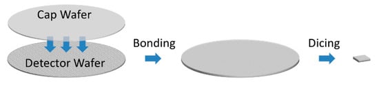 The thermal conduction via the atmosphere takes over a large fraction in the total thermal conduction, especially when the pixel size is small. Since the temperature change and thus the responsivity is proportional to the thermal conductance, the vacuum packaging of the microbolometer pixels is necessary to eliminate the thermal conduction through air. Unfortunately, the cost of the vacuum packaging is one of the major cost drivers for the microbolometer IRFPA. The typical vacuum level required here is below 1 Pa, which raises a challenge to the packaging technology [100]. Although such requirement could be achieved via one-by-one pumping through a fine-bore tube, the cost becomes a bottleneck in lowering the cost of uncooled IRFPAs. Figure 9 shows the concept of the wafer-level packaging (WLP) technology for IRFPA, which is a popular option for cost reduction [59,101,102]. In this technology an IR transparent cap wafer is bonded to the IRFPA wafer under vacuum and then the hermetical sealing is achieved using solders. Several steps are needed prior to the bonding to accomplish the cap wafer. The cavities for the pixels are formed via etching, and then both sides of the cap wafer are antireflection-coated, afterwards the vacuum getters are deposited inside the cavities. The WLP technology is a practical technology that is capable to reach an average seal yield > 95% with correct parameters [103].