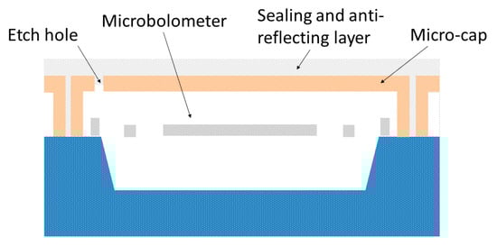 Although the wafer level packaging technology provides a significant cost reduction, it still takes a considerable proportion in the total cost of the uncooled IRFPA, especially for the low-end market. A pixel level packaging (PLP) technology has been developed to address this issue [104,105,106]. The PLP process consists in the manufacturing of IR transparent microcaps that cover each pixel in the direct consequent step of the wafer level bolometer fabrication, i.e., no extra bonding process is needed. Figure 10 shows the schematics of a packaged pixel. To form this structure, first, a sacrificial layer with trenches around each pixel is formed above the microbolometer via deposition and etching. Then, an IR transparent material is deposited to form the microcap structure. After that, etch holes are formed through the IR transparent microcap and the sacrificial layer is removed. Finally, a sealing and anti-reflecting layer is deposited under high vacuum. The pixel using PLP keeps a stable vacuum level below 10−3 mbar and shows nominal performance after one year of ageing, demonstrating the PLP to be a prospective novel vacuum packaging technology for the microbolometer IRFPAs.