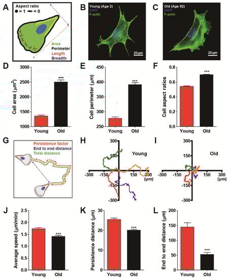 Biological age-dependent changes of cell morphology and motility. (A–F) Age-dependent distinct cell morphology. Schematic defining of single cell morphology (A). Representative immunofluorescence confocal microscopy of young (age < 5) and old (age > 80) human dermal fibroblasts (HDFs) displaying F-actin (green) and nucleus (DAPI, blue) (B,C). Note that young and old cells depict HDFs obtained from 2- to 3- year-old cohorts and 85- to 92- year- old cohorts, respectively. Old cells are larger (D,E) and less elongated (F) than young cells. Cell aspect ratio is defined as W/L, where L is the longest chord of the cell and W is the caliper width, perpendicular to the length, approaching 1 for a less elongated and relatively symmetric cell shape and 0 for an elongated cell shape. More than 600 cells were analyzed for each condition. (G–L) Age-dependent alteration of cell motility. Schematic definition of single cell motility illustrates cell trajectory (orange), persistence vectors (red), and end-to-end distance (blue) of HDFs migrating on a type-I rat-tail collagen coated glass coverslips (G). Representative cell trajectories of young (H) and old HDFs (I) displayed distinct cell migration depending on cellular age. Systematic cell tracking based on time-lapse cell monitoring reveal that biological aging significantly reduces cell migrating speed (J) and migratory persistence (K,L). Note that average speed is the total distance traveled by the cell for 8 h of total monitoring time (J), indicating instantaneous motility of the cell, while persistence distance assessed by an average length of persistence vectors (K) and end-to-end distance (L) implies the persistence of cell migration. More than 50 cells were analyzed for each condition. In panels (D–F) and (J–L), error bars represent S.E.M. of average values and statistical significance was assessed by the unpaired t-test; *** p < 0.001.