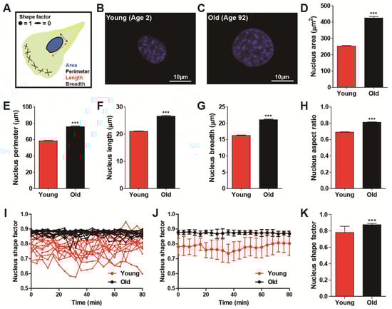 Age-dependent alteration of nuclear morphology. (A–H) Morphometric comparison of nuclear morphology between young (age < 5) and old (age > 80) HDFs. Schematic defining of descriptors of nuclear morphology (A). Note that shape factor is defined as 4π(area)/(perimeter)2, and thus, the nucleus shape factor of elongated and round nuclei approaches 0 and 1, respectively. Representative immunofluorescent images of nuclei of young and old HDFs stained with DAPI (B,C). Nuclei of young cells are smaller (D–G) and more elongated (H) than nuclei of old cells. More than 600 cells were analyzed for each condition. (I–K) Time-lapse monitoring of nuclear shape. Fluctuation of nuclear shape changes in young cells is larger than changes in nuclear shape in old cells (I,J). Nuclei were imaged using time-lapse fluorescence microscopy, every 4 min, for 80 min. Time-lapse monitoring of nucleus shape factor (I) and fluctuation of their average values (J) are presented. Average values of time-lapse monitored nuclear shape factor indicate nuclei of young cells are more elongated and they change their shape more dynamically than nuclei of old cells (K). More than 10 cells were monitored for each condition (young, 13 cells and old, 15 cells). In panels (D–H), error bars indicate S.E.M. and statistical differences were calculated using the unpaired t-test; *** p < 0.001. In panels (J) and (K), error bars indicate standard deviation (S.D.) and statistical differences were calculated using the unpaired t-test. *** p < 0.001.