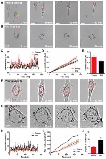 Migratory fibroblasts placed on a flat surface systematically switch between directional migration mode and a less motile hesitation mode, typically displaying elongated nuclear shape and round nuclear shape, respectively [24]. Since nuclear shape is also highly intertwined with distinct nuclear motion during cell migration, we analyzed whether age-dependent alterations in cell motility could differentiate nuclear motion. First, we characterized nuclear translocation in migrating HDFs of young and old age, where time-lapse live-cell tracking was applied to measure the centroid displacement of the nucleus during random cell migration (Figure 3). While nuclei of young HDFs revealed the directional, persistent translocation along the direction of cell migration, nuclear translocation of old HDFs barely occurred (Figure 3A,B). Quantification of distances that the nucleus traveled further confirmed rapid displacement of young HDF nuclei (Figure 3C–E).