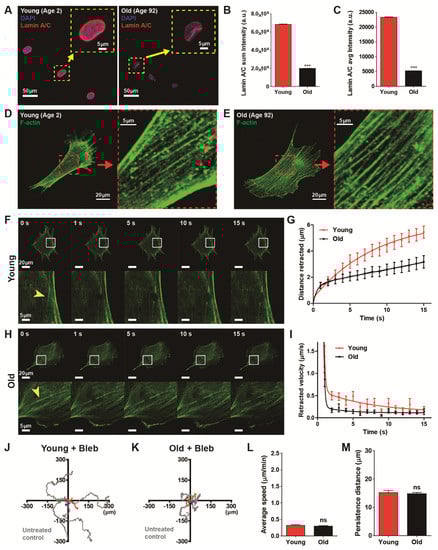 Therefore, we hypothesized that lamin A/C content-dependent contractility of actin stress fibers could differ with biological aging. To this end, we assessed the cytoskeletal tension of actin stress fibers of young and old HDFs using laser ablation (Figure 4F–I). As described previously [32], an endogenous actin stress fiber was visualized in each green fluorescence protein (GFP)-actin transfected cell. When the laser was focused on a small area (~500 nm) in the middle of a randomly selected single F-actin fiber lying on the basal surface of the cell cultured on a collagen-coated glass bottom dish, the fiber was immediately (<1 s) ablated and progressively retracted to the opposite direction (Figure 4F,H). The distance of retraction of the actin stress fiber was 1.7-times larger in young HDF (5.44 μm) than in old HDF (3.17 μm) after 15 s of laser ablation (Figure 4G), i.e., actin cytoskeleton retraction was faster in young HDFs. These results indicate that cytoskeletal tension in young HDFs is higher than in old HDFs, and actomyosin contractility becomes weaker as the expression of lamin A/C diminishes with the aging process.