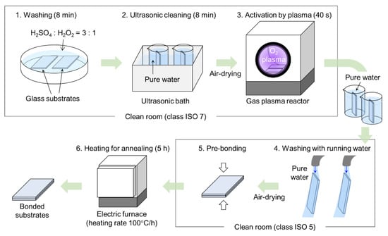 Schematic diagram of low-temperature bonding process for glass substrates utilizing typical facilities in clean rooms.