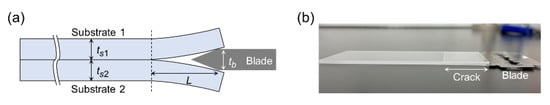 where tb is the thickness of the blade, ts is the thickness of the glass substrate, and Es is Young’s modulus [28]. As shown in Figure 2b, the blade was inserted into the bonding interface between glass substrates, and the crack propagation length was measured.