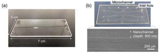 The field of microfluidics has rapidly developed to realize various applications, including chemical analysis and synthesis, medical diagnosis, and tissue engineering [1,2,3]. Recently, the field has been further downscaled to nanofluidics, exploiting volumes of attoliters to femtoliters where surface effects are dominant [4]. Novel applications have been reported such as single-molecule sorting [5] and analysis [6], high-efficiency separation utilizing solid/liquid [7] and liquid/liquid phases [8], single-cell proteomics [9], and autonomous solar-light-driven fuel cells [10]. To realize these devices, micro/nano fabrication technologies are important. Recently, the direct writing technologies, such as 3D printing using polymer materials, has rapidly developed to realize easy and high-throughput production [11,12,13]. However, the fabrication of nanostructures like nanopillars and nanochannels is still difficult. Currently, polydimethylsiloxane (PDMS)-based fabrication technologies are most widely used. Microchannels can be easily fabricated by replica molding technique (soft lithography) [14]. PDMS-made devices have optical transparency suitable for detections, and surface chemical modification utilizing surface silanol groups is available. However, maintaining the shape of nanostructure is difficult due to its softness, and the material’s solubility to organic solvents and gas permeability restrict its use. On the other hand, glass-based fabrication technologies are challenging compared with others, but can achieve glass-made devices with mechanical robustness suitable for realizing nanostructures, chemical stability to organic solvents, optical transparency for detections and availability of surface chemical modification.