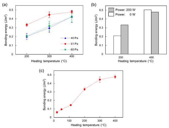We also investigated the effects of surface activation by oxygen plasma on the bonding energy. Figure 4b shows a comparison of the bonding energy at different plasma powers (0 and 200 W). The pressure in the reaction chamber was set at 51 Pa. At a heating temperature of 200 °C, the bonding energy with surface activation for a power of 200 W increased 1.7 times compared to that without surface activation (power: 0 W). At a heating temperature of 400 °C, the bonding energies at powers of 0 and 200 W became comparable. The results indicate that, for lower heating temperatures, the bonding strength is increased by activating the surface.