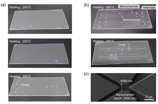 Based on the results shown in Figure 4, the low-temperature glass bonding method with an optimized pressure of 51 Pa was used to bond fused-silica and borosilicate glass substrates. Figure 5 shows the results of bonding at different heating temperatures. The 0.17-mm borosilicate glass substrate, which is a standard cover glass for microscopy, was used. In the case of substrates without any fabrication (Figure 5a), the bonding was successful at heating temperatures of 200 and 250 °C. However, at a heating temperature of 300 °C, cracks were generated owing to the thermal stress caused by the order of magnitude difference in thermal expansion coefficients between fused-silica (0.5 × 10−6 K−1) and borosilicate (7.2 × 10−6 K−1). On the other hand, in the case of substrates with micro- and nanochannels (Figure 5b), cracks were generated even at a temperature of 250 °C, probably because of stress concentration at the places where the channels were fabricated. At a temperature of 200 °C, we succeeded in fabricating a micro/nanofluidic device containing microchannels (width: 500 μm, depth: 10 μm) and nanochannels, as shown in Figure 5c. The results suggest that the fabrication of micro- and nanochannels affects an appropriate heating temperature for bonding different glasses due to the concentration of thermal stress. Therefore, to fabricate micro/nanofluidic devices by bonding fused-silica and borosilicate glass substrates, using a heating temperature lower than 200 °C is important to avoid crack generation due to the thermal stress.