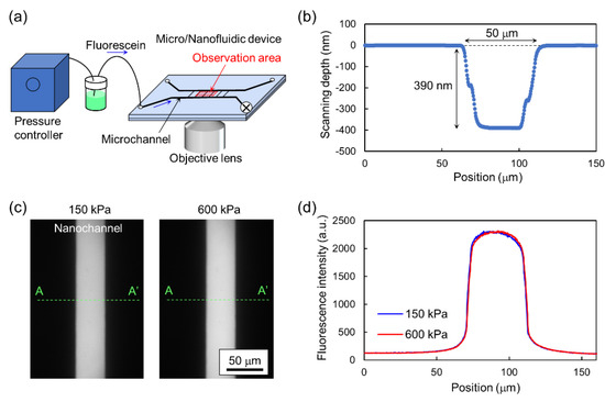 Examination of the pressure resistance of a micro/nanofluidic device by fluorescence microscopy. (a) Experimental setup. (b) Cross-sectional profile of a nanochannel measured by stylus surface profiler. (c) Fluorescence images of nanochannel where fluorescein solution was injected by external pressure. (d) Profiles of fluorescent intensity in transverse direction of nanochannel (A-A′).
