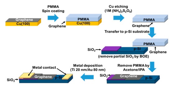 - Abdalrheem, R.; Yam, F.K.; Ibrahim, A.R.; Lim, H.S.; Beh, K.P.; Ahmed, A.A.; Oglat, A.A.; Chahrour, K.M.; Farhat, O.F.; Afzal, N.; et al. Improvement in photodetection characteristics of graphene/p-Silicon heterojunction photodetector by PMMA/graphene cladding layer. J. Electron. Mater. 2019, 48, 4064–4072. [Google Scholar] [CrossRef]