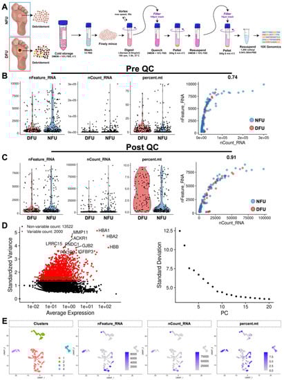 Data processing and quality control. (A) Samples were collected from the wound clinic and processed into cellular suspensions for single cell RNA sequencing. (B) Each sequenced cell is plotted to show their number of RNA features (nFeature_RNA), absolute numerical count of RNA (nCount_RNA), and percent mitochondria (percent.mt). (C) Post quality control (QC) filtering of these cells. (D) Highly variable genes within this dataset are used to partition cells along 15 principal components (PC). (E) Four transcriptionally distinct subpopulations are identified, with feature plots of nFeature_RNA, nCount_RNA, and percent.mt overlaid.