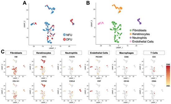 Debrided diabetic foot ulcer (DFU) tissue was collected from one patient and immediately placed into a solution of Dulbecco’s Modified Eagle Medium (DMEM; Sigma-Aldrich, St. Louis, MO, USA) with 10% fetal bovine serum (FBS; ThermoFisher, Waltham, MA, USA) and stored on normal ice (to keep samples at 4 °C). Then, debrided non-diabetic foot ulcer (NFU) tissue was collected from a second patient in the same fashion 1.5 h later. Samples remained on ice at the wound clinic for 1.5 to 3 h following debridement before transfer to the laboratory for processing. At the laboratory, samples were rinsed three times with 1x phosphate buffered saline (PBS; Fisher Scientific, Waltham, MA, USA) to cleanse samples of media and FBS that would quench the enzymatic digest solutions added next. Samples were cut into ~2–3 mm3 pieces with a scalpel and finely minced with fine scissors until a sludge-like consistency (<~0.1 mm3 pieces). Although samples were already small prior to mincing (<100 mm3), effort was made to ensure that a fine a consistency was reached, as finer tissue pieces have superior cellular yields. The resulting tissue was placed into a 50 mL conical tube containing 20 mL Liberase (Sigma-Aldrich) in PBS at a concentration of 0.5 mg/mL for enzymatic digest. The cell-digest suspensions were constantly agitated (rotated) for a total of 1.5 h at 37 °C. Every half hour, the sample was subjected to maximum speed on a vortex mixer (VWR) for 30 s to physically disrupt any tissue that had clumped together and thus maximize the tissue surface area exposed to enzymatic digestion at all times. The cellular and enzymatic solution was then pipetted through a 100 µm Nylon cell filter (Fisher-Scientific) into a new conical tube, and 20 mL of 10% FBS DMEM was added through the filter to quench the enzymatic reaction and release any cells trapped within the filter, maximizing downstream cell yield. Solutions were then spun at 300× g for 8 min at 4 °C in a centrifuge to pellet the cells, resuspended in 20 mL 10% FBS DMEM, and passed through a 70 µm Nylon cell filter. A 20 mL solution of 10% FBS DMEM was added through the filter to collect the remaining cells, and the solution was re-spun to obtain a final cell pellet. This pellet was resuspended to a final cellular concentration of 1200 cells/µL in 0.04% Bovine Serum Albumin (BSA; Sigma-Aldrich) in PBS in accordance with the maximum capture, concentration short of overloading, per specifications from 10X Genomics (Pleasanton, CA, USA).
