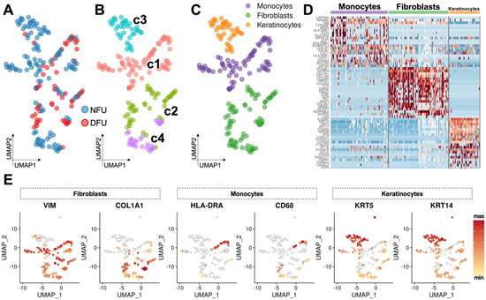 Re-clustering of initial fibroblast clusters demonstrate four provisional subclusters. (A,B) Recursive re-clustering reveals four provisional subclusters (c1–c4) which further identify as (C) fibroblasts, monocytes, or keratinocytes. (D) Heatmap demonstrating top differential genes between these newly refined cell annotations. (E) Manual evaluation of key cell type markers.