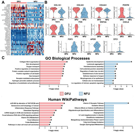 Diabetic wound fibroblasts exhibit increased expression of known pro-fibrotic markers. (A) Heatmap of differential genes between DFU and NFU in the refined fibroblasts. (B) Violin plots of specific differential genes. (C) Enrichment pathway analysis using the top twenty-five genes for each group. * (p < 0.05).