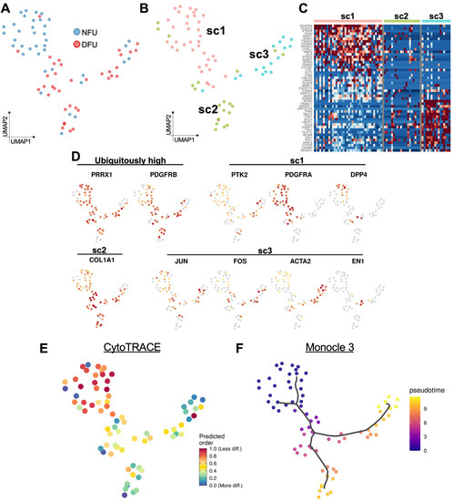 Interestingly, diabetic and non-diabetic tissue showed considerable differences in their representation among these three clusters. Non-diabetic foot ulcer (NFU) cells were distributed primarily within sc1, the traditional fibroblast subpopulation, while diabetic foot ulcer (DFU) cells were comparatively enriched among the collagen producing sc2 and pro-fibrotic sc3 populations. Additional analysis with CytoTRACE suggested that DFU fibroblasts were in aggregate more differentiated than non-diabetic wound cells, potentially a consequence of the global metabolic changes associated with diabetes that may drive fibroblast differentiation into the more pathologic sc2 and sc3 cell states (Figure 5E). Indeed, when we set the root of differentiation origin at the NFU cells in sc1 using Monocle3, we can also see how these fibroblasts progress along transcriptional trajectories starting at sc1 and then branching into either sc2 or sc3 with increasing pseudotime (Figure 5F).