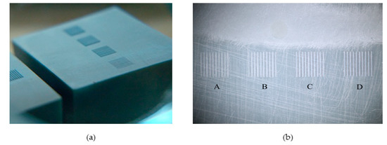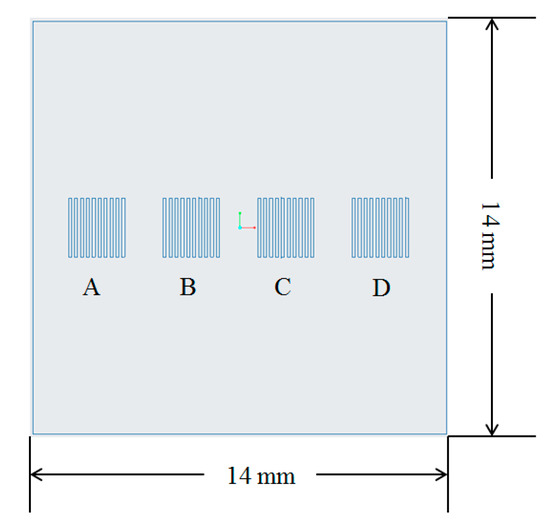 The micro cavities in the injection molding tooling insert were designed to mimic the features that characterize a microfluidic chip. Figure 1 shows the design of one of the tooling inserts and the location of the microfeatures on its top surface. Different microstructures were designed with different sizes and aspect ratios. Each group of features had a nominal channel width and pitch of 100 µm. However, the structures in the tooling inserts had a height of (A) 25 µm, (B) 50 µm, (C) 75 µm, and (D) 100 µm. Indeed, variation in features height allowed evaluation of the effect of aspect ratio on replication, where researchers identified this as the most significant parameter for replication of microstructured surfaces by injection molding [37]. The tooling inserts had a 14 mm square overall size, with thickness of 10 mm.