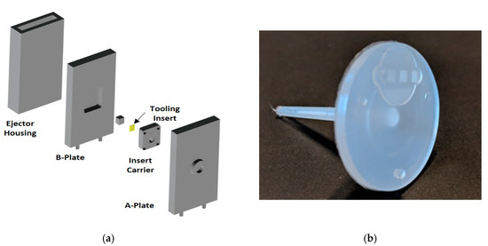 (a) Exploded view of the mold base shows the assembly of the 3D printed tooling insert in the steel mold and (b) plastic part injection molded using the 3D printed tooling insert and replicated microfeatures.