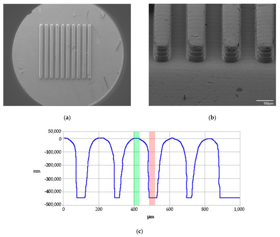 The replication accuracy of the injection molding process carried out with the SLA printed tooling inserts was evaluated by metrological characterization of the replicated structures and comparison with their nominal tool dimension. The height of the replicated microstructures was acquired using a contact profilometer (Bruker XT, Billerica, MA, USA). The height of the replicated structures was measured by monitoring the force transmittance of a stylus as it was dragged across the topography of the sample. The difference between the top surface of the plastic part and the bottom of the structures replicated on the tooling insert was defined as the replicated depth. From channel depth measurements, the feature depth ratio (DR) was calculated as