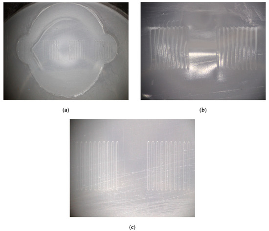 The print time for all tooling inserts was 4 h and 12 min, and each insert was UV flood post-cured for 4.5 min. Figure 2 shows one of the printed tooling inserts and details of the microfeatures. A total of 10 inserts were produced for this study; all inserts were printed simultaneously in a single build. This parallelization of tooling production is considered an advantage of the DLP-SLA system.