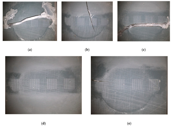 Images of tooling inserts: (a) Tool 1 after 36 shots, (b) Tool 2 after 16 shots, (c) Tool 3 after 29 shots, (d) Tool 4 after 60 shots (not cracked), and (e) Tool 5 after 78 shots.