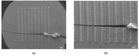 In injection molding of microfluidic devices, a tooling insert with the microchannel layout is commonly employed in the cavity to form the features on the part surface [11,12,13]. After the predetermined amount of polymer is injected into the mold, pack pressure applied to the melt typically completes the formation of the features. To attain higher replication of microfeatures, the process usually requires elevated melt temperatures [13,14,15] and high injection pressures and velocities [16] to decrease the viscosity of the polymer through shear heating and to delay the solidification of the melt as it comes into contact with the mold wall [15]. Additionally, many researchers believe that mold temperature is the highest temperature setting effect on the process and recommend the mold temperature be higher than the glass transition temperature of the polymer being injected [14,16]. The high temperatures and pressures, however, place considerable stress on the tooling inserts.