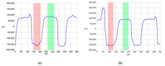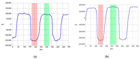 Contact profilometry traces, shown in Figure 11, illustrate the replication fidelity. The profilometry traces were taken from a cross-section of the parts molded from Tool 4. These traces indicate that the lands of the “channels” (which were molded from the base of the tooling) were flat and at a uniform height. The bottoms of the channels were rounded, reflecting the curvature at the top of the projections in the tooling. The shape of the microfeatures also was consistent over multiple molding cycles. Overall, these characteristics indicate a well-replicated system. It should be noted that the contact profilometry exhibited some limitations in the acquisition of the side walls of the microstructures. Indeed, the vertical resolution does not allow accurate reconstructions of the features, as observed in Figure 11 and Figure 12. This limitation, however, does not affect the vertical resolution of the structures that was used as the response variable for the study (cf. Equation (1)).
