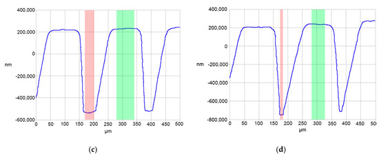 Contact profilometry traces for (a) part 45 from Group A, (b) part 30 from Group B, (c) part 25 from Group C, and (d) part 5 from Group D microfeatures molded from Tool 4.