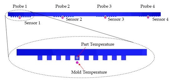 The numerical model developed in Section 3 was used to study the effect of selecting different mold materials on the injection molding process. For each one of the selected mold materials, a complete Fill + Pack + Cool (Transient) + Warp analysis was run. This approach allowed studying of the transient thermal behavior of the mold. In fact, the thermal analysis is run before the injection starts, in order to determine the steady-state condition, and then during the cycle in order to evaluate the temperature evolution during the process. The temperature of the part and the mold were monitored in the microstructured area for a single cycle, as shown in Figure 13. For each group of microstructures, a probe was inserted to acquire the temperature of the plastic at the entrance of the microstructures. For each group of microstructures in the mold, a sensor was used to acquire the temperature of the tooling at a distance of 0.1 mm from the bottom of each microfeature cavity. This allowed the evaluation of the effect of the aspect ratio on the microscale cavity depth.