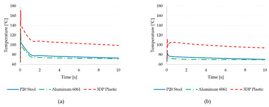 Figure 14 shows the history of temperature in the part and the mold, as measured close to the microfeatures. It can be observed that the metal tools are characterized by a significantly smaller increase in part temperature during filling (Figure 14a). Conversely, the temperature of the polymer increases steeply with the 3D printed tool, and it does not recover after filling upon cooling. The effect of the low thermal conductivity is also visible when considering the mold temperature in Figure 14b. Indeed, the plastic tool leads to a stronger rise in the mold temperature, which is not recovered after filling. These results suggest that the short life of the 3D printed tools can be explained the long time required to stabilize the mold temperature after the cycle. The time required to reach the set mold temperature, however, would require a very long time, thus increasing the cycle time significantly. Moreover, the longer time significantly affects the viscosity and stability of the melt (shot) waiting to then be delivered in the next molding cycle.