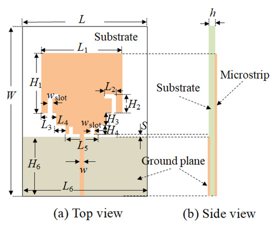 The antenna structure designed in this paper is shown in Figure 1. The dielectric substrate is Rogers 4350, with the relative dielectric constant 3.66, the loss tangent 0.004, and the thickness h of substrate 0.508 mm. The size of the UWB antenna is 36 mm × 23 mm, which is smaller than the recent reports on the most of ultra-wideband antenna in Table 1 [14,15,16,17,18,19,23,24,25,26]. The feed line is connected with the side of the stepped rectangular microstrip. The radiation microstrip patch near the feed line is loaded by the two L-shaped slot structures on both sides, respectively. A stepped impedance microstrip structure is implemented between the feed line and the radiate microstrip patch, which can improve the impedance characteristics of the antenna. The microstrip patch of the stepped impedance microstrip loaded with axisymmetric I-shaped slots can improve the bandwidth and the performance in-band. A ground plate exists on the back of the dielectric layer, where the feed line is located on the top. A narrow gap is formed between the radiating patch and the feed line.